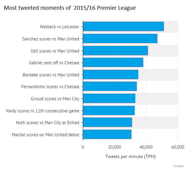 The most tweeted moment pertained to Arsenal forward and England international Danny Welbeck’s last gasp winning goal against league leaders Leicester City last week, according to the Mirror.